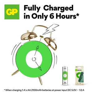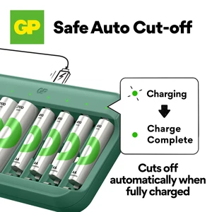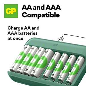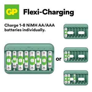 The GP Recyko E822 is a USB-powered battery charger that charges up to 8 batteries simultaneously in a simple, reliable and safe manner. The charger has separate charging channels and LED indicators that show the battery status.