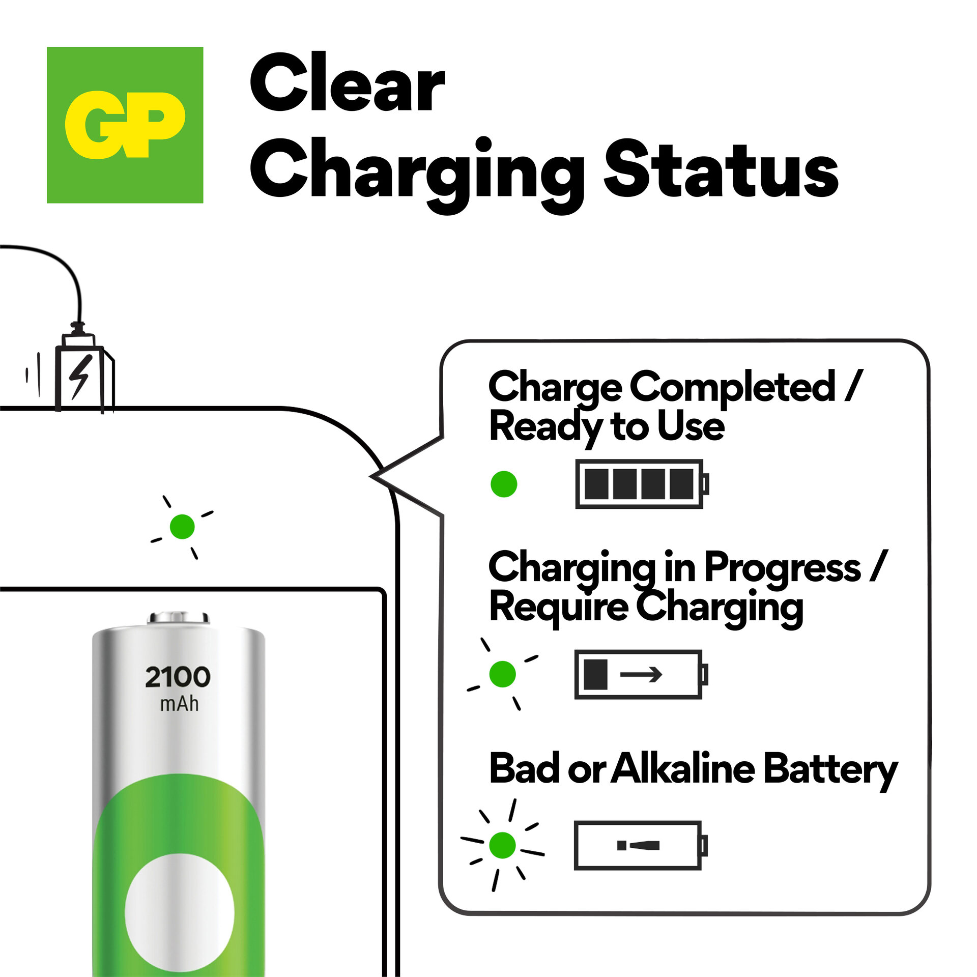 - Green LED lights up for 0.5 seconds when the charger is connected to power