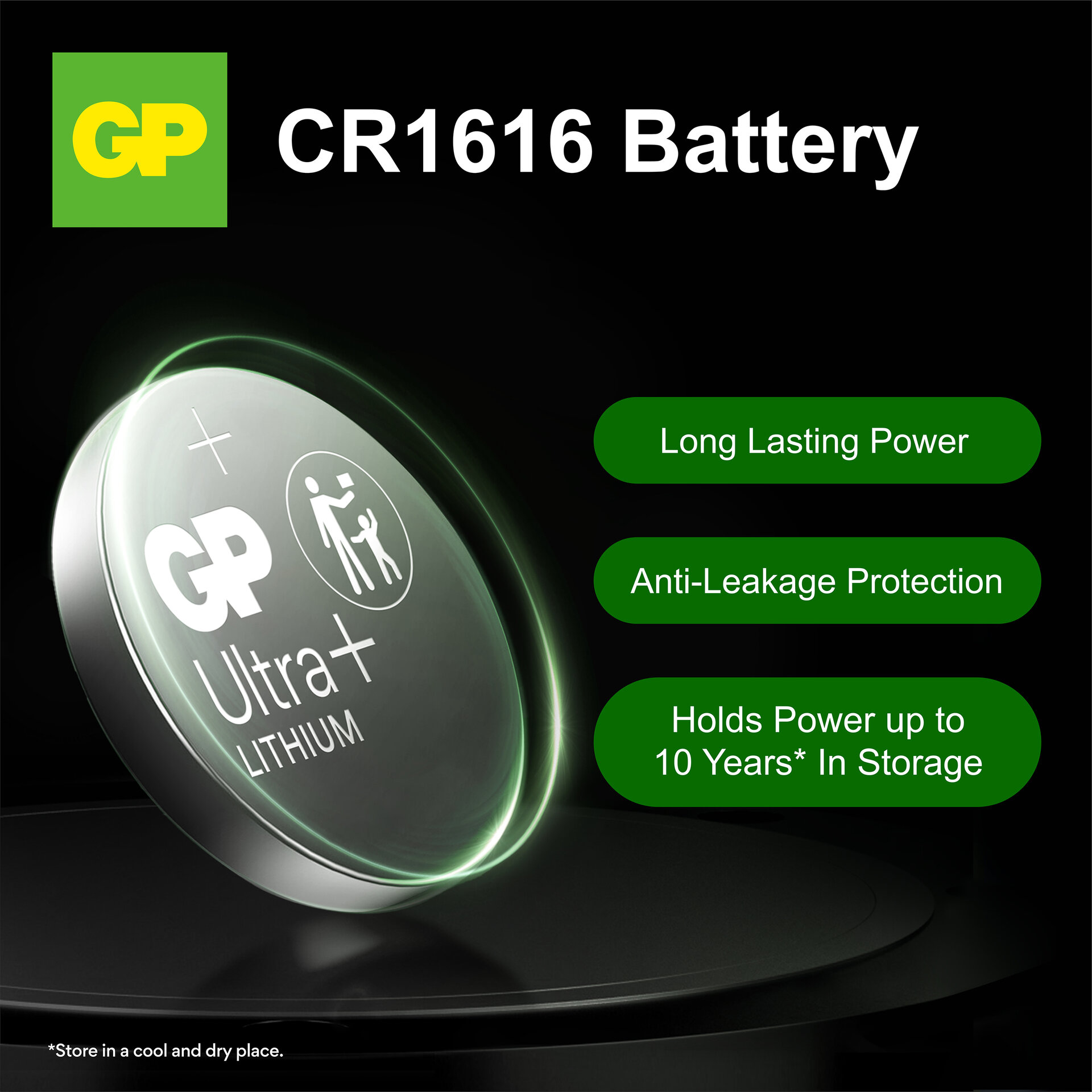 Long shelf life – Stock up with confidence – GP Ultra Plus Lithium button cell CR1616 offers an impressive shelf life of up to 10 års when stored properly in a cool, dry place.