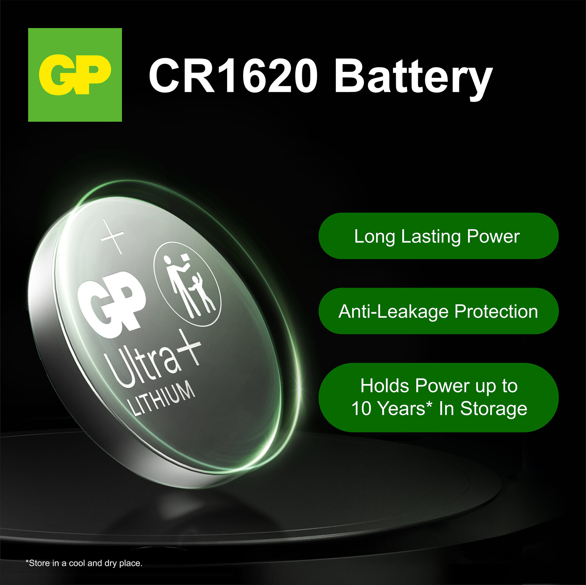 Long shelf life – Stock up with confidence – GP Ultra Plus Lithium button cell CR1620 offers an impressive shelf life of up to 10 års when stored properly in a cool, dry place.
