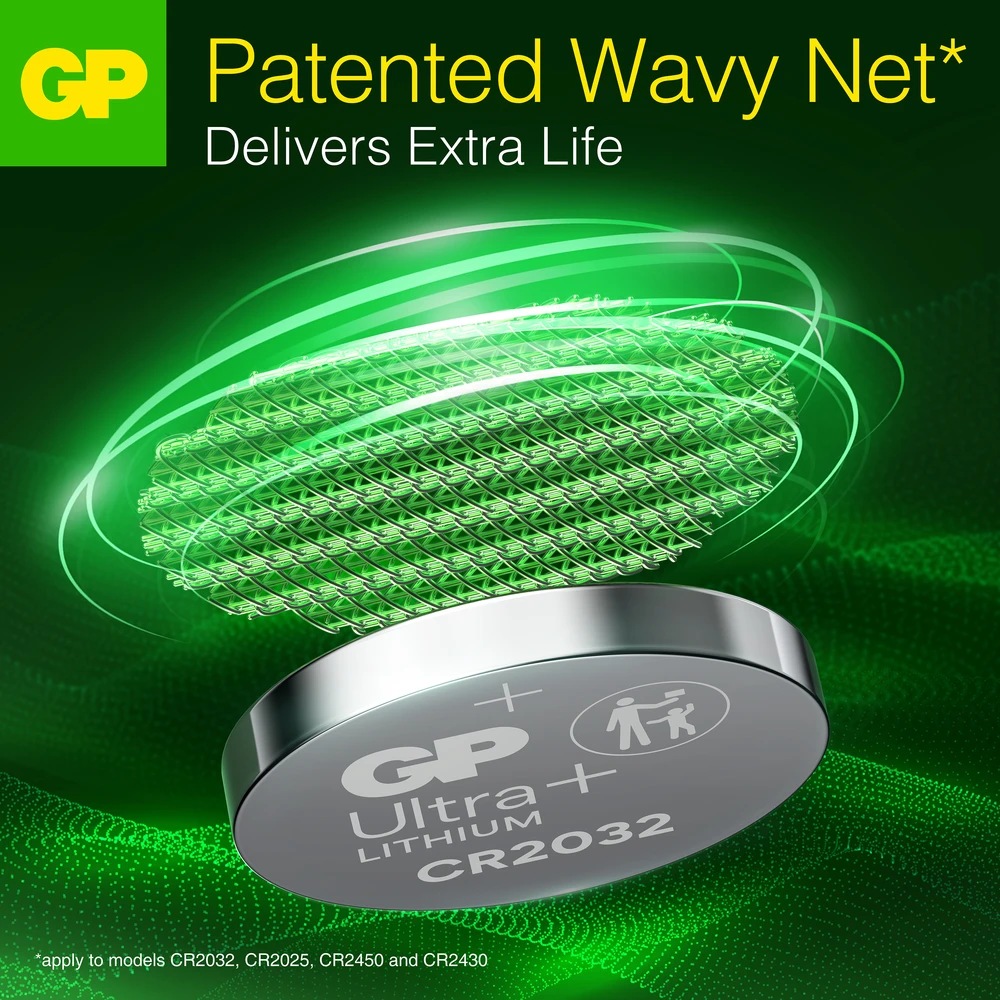 GP Ultra Plus Lithium button cell batteries CR2032 äre designed with patented Wavy Net technology for stable energy and up to 80% longer lifespan*.