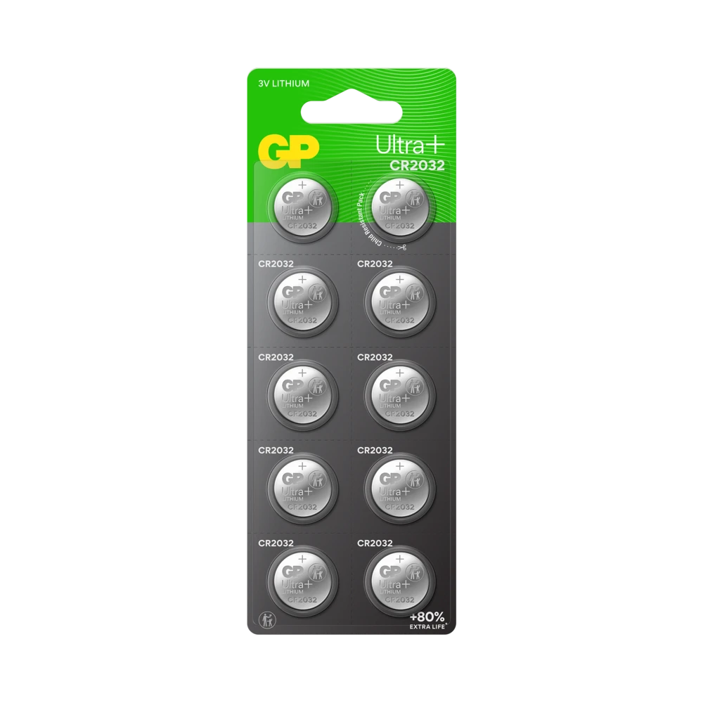 GP Ultra Plus Lithium button cell batteries CR2032 äre designed with patented Wavy Net technology for stable energy and up to 80% longer lifespan*.