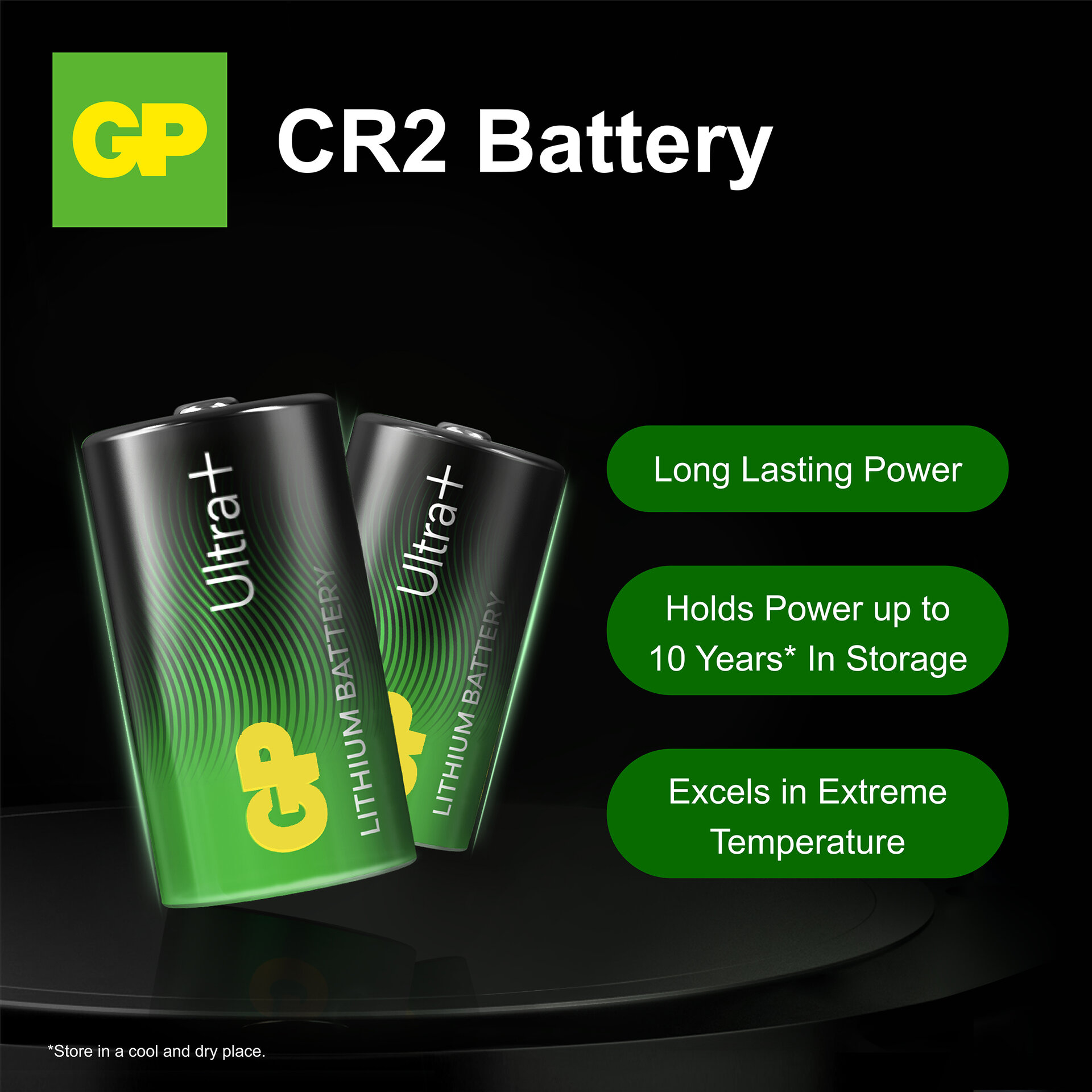 GP Ultra Plus Lithium CR2 battery delivers reliable power and long-lasting energy you can trust. When stored properly – in a cool and dry place – it offers a shelf life of up to 10 years.