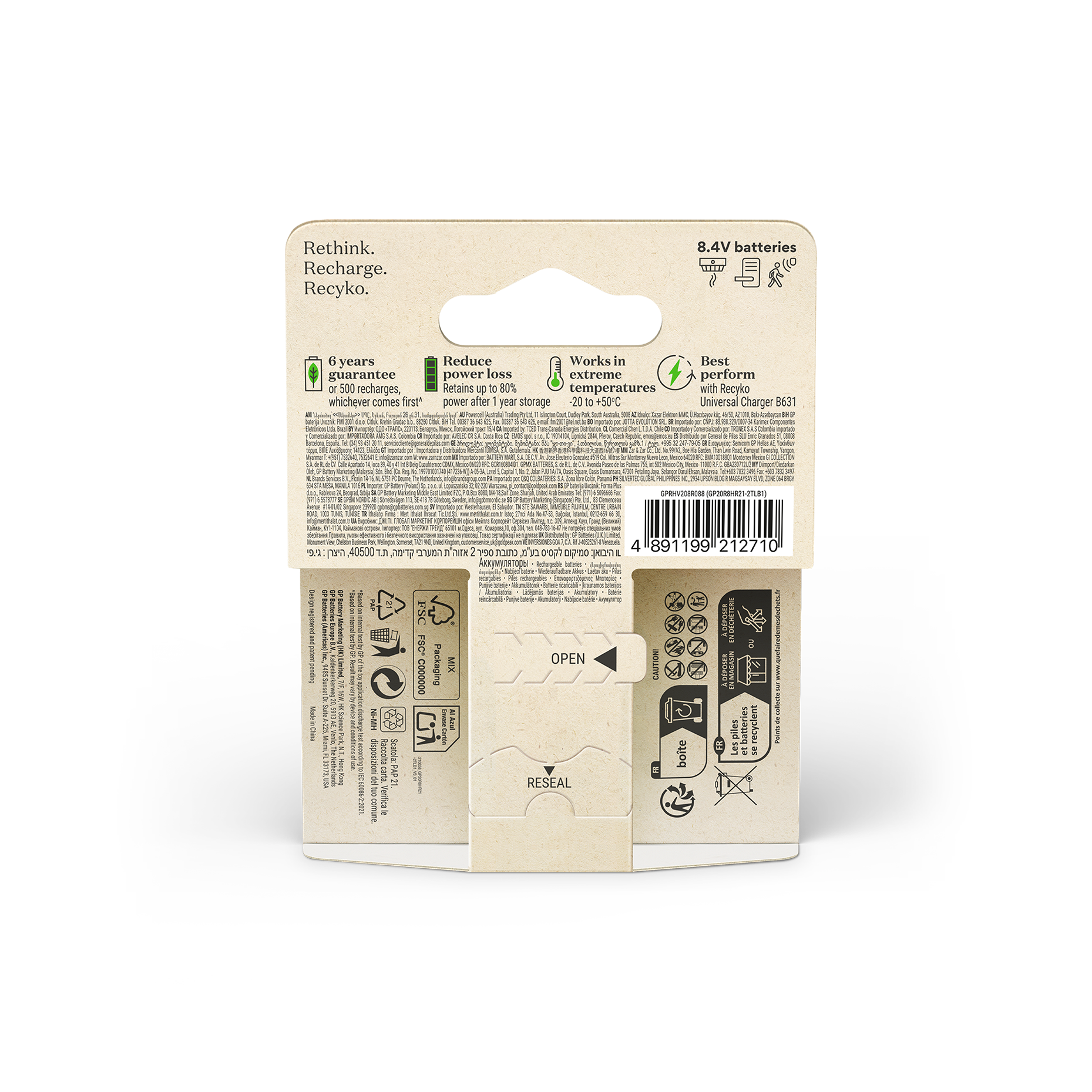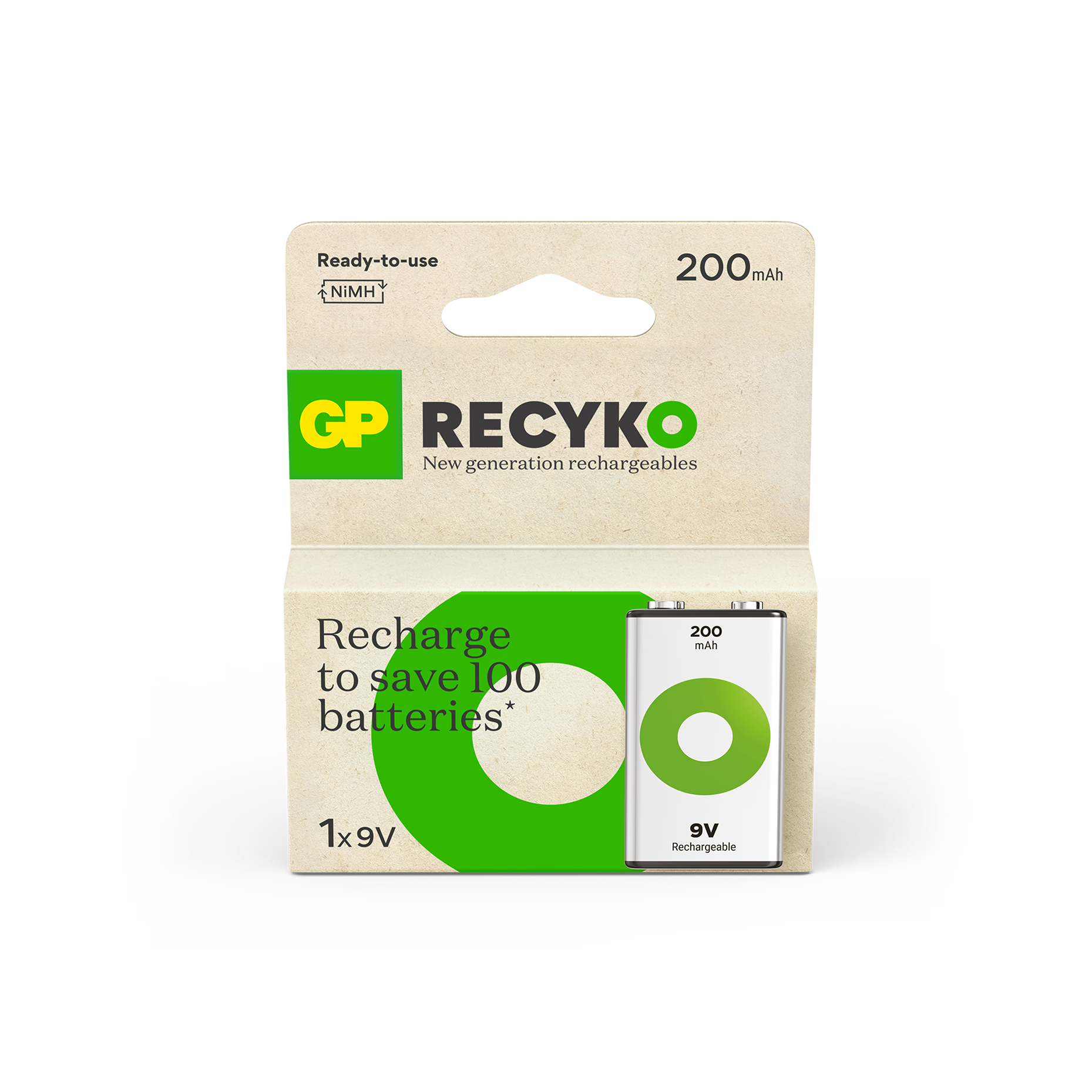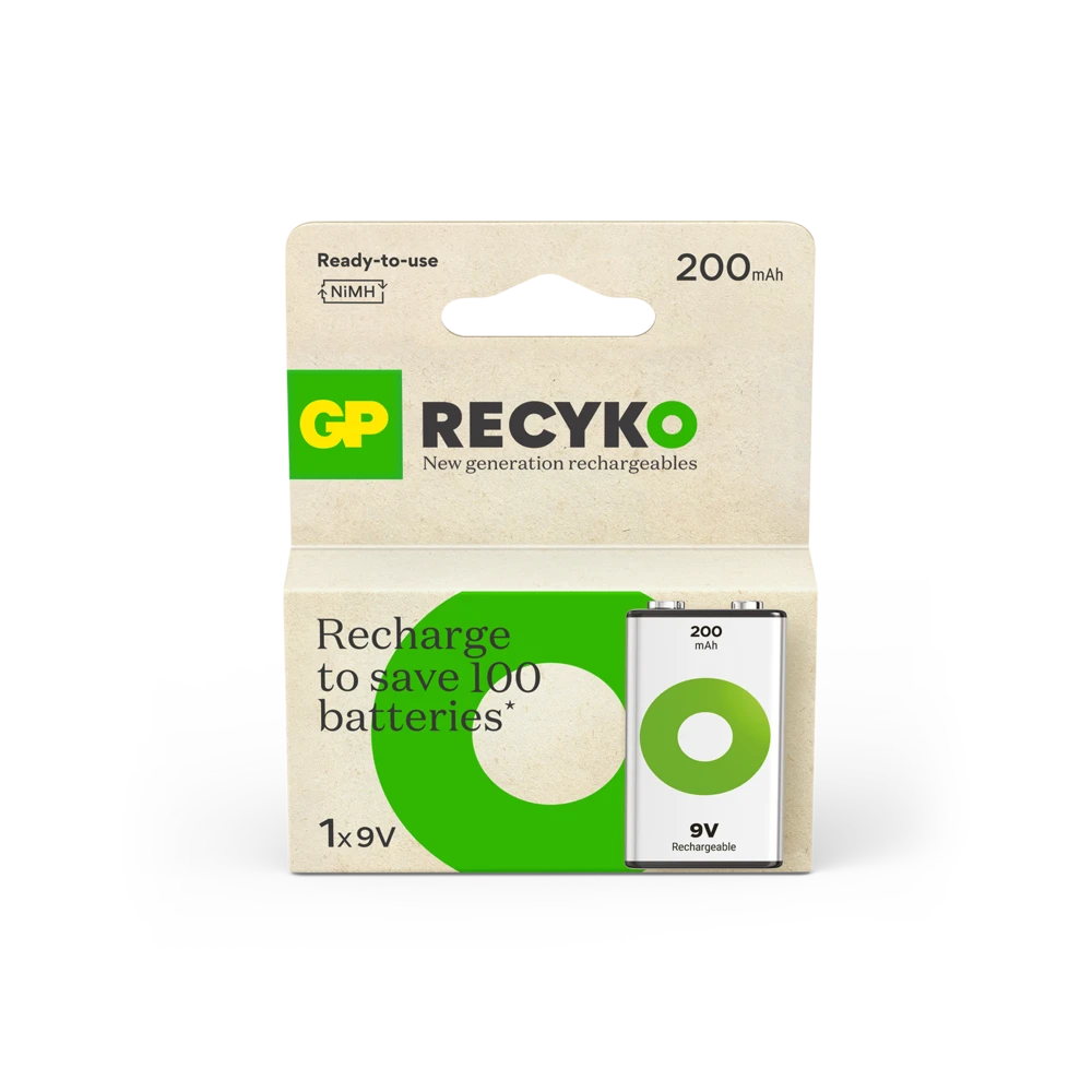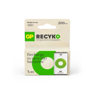 The GP Recyko 9V Battery 200mAh is a powerful rechargeable battery designed for your everyday use. They are charged upon purchase and ready to use right out of the box. Unlike disposable batteries, ReCyko can be used at low temperatures, down to - 20°C, ensuring reliable performance in extreme temperatures. More than 90% of the battery, including packaging, is recyclable.