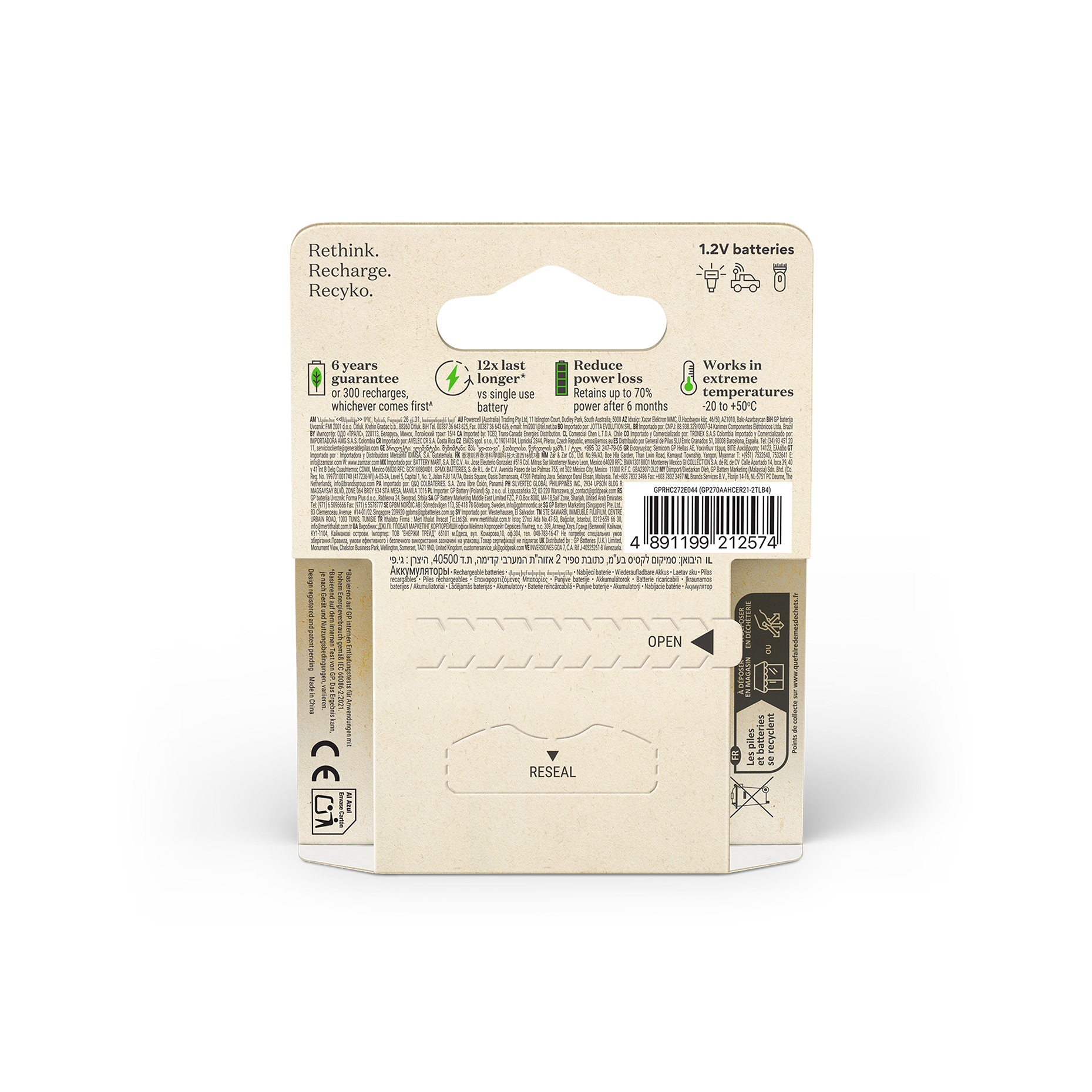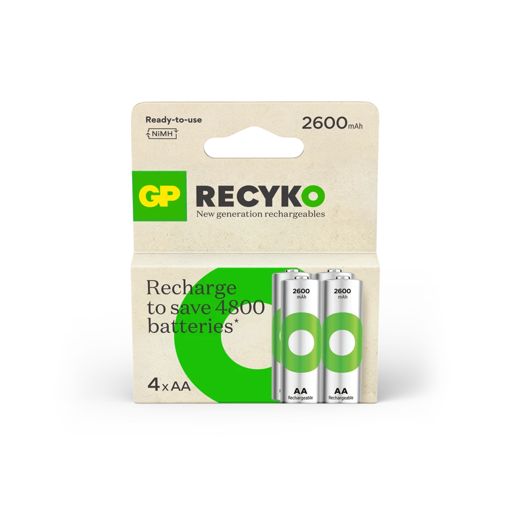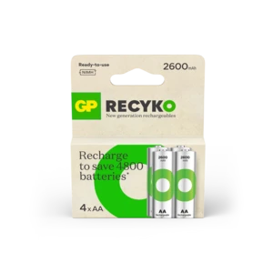 The Recyko 2600mAh battery is a powerful rechargeable battery designed for your everyday use. They are charged upon purchase and ready to use right out of the box. Unlike disposable batteries, ReCyko can be used at low temperatures, even down to - 20°C. The battery is also created with more than 10% recycled materials and over 90% of the battery, including packaging, is recyclable.
