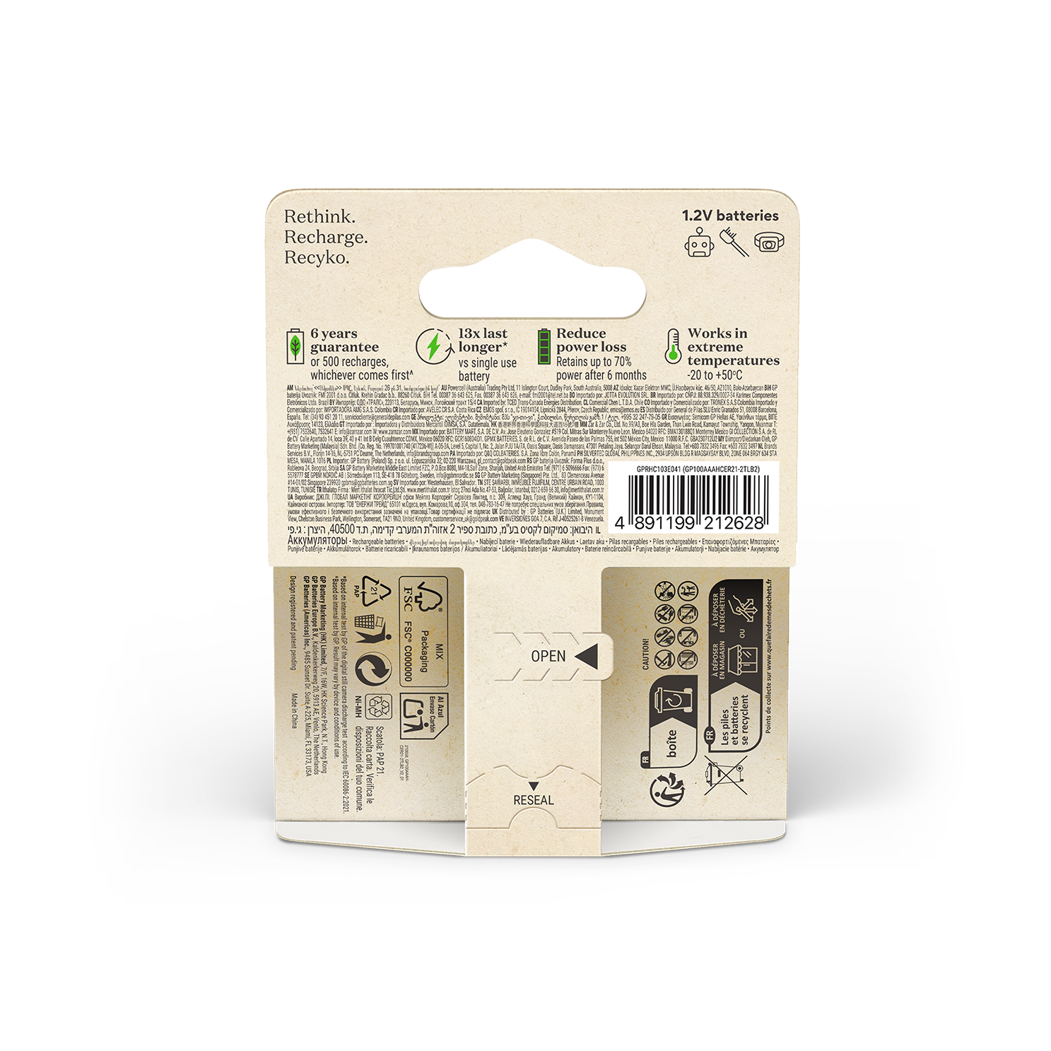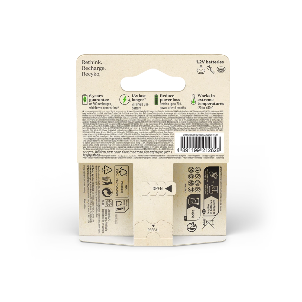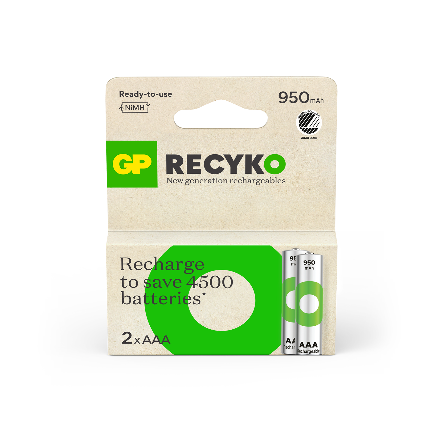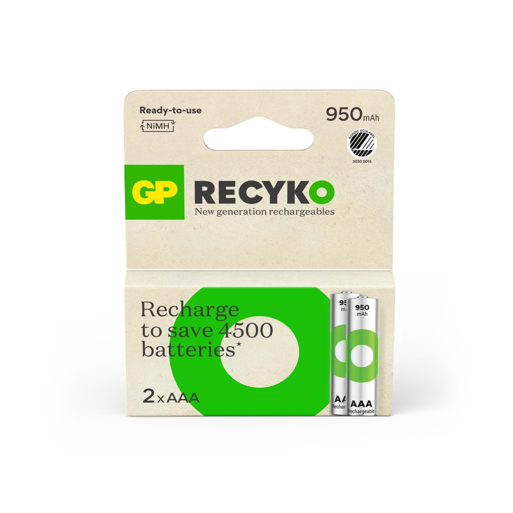 The ReCyko 950 is a powerful rechargeable battery designed for your everyday use. They are charged upon purchase and ready to use right out of the box. Unlike disposable batteries, ReCyko can be used at low temperatures, down to - 20°C. The battery is also created with more than 10% recycled materials and a full 94% of the battery, including packaging, is recyclable.