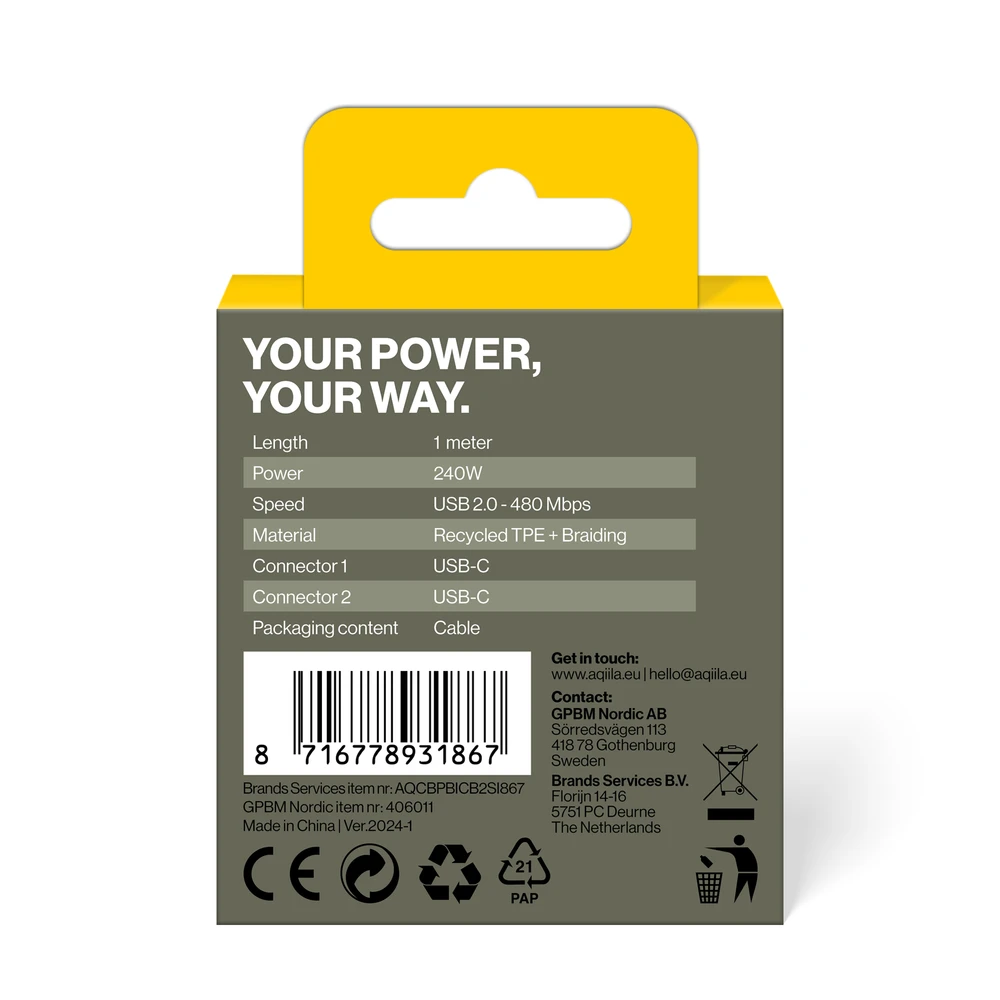 Specification:Length 1 meterPower 240WSpeed USB 2.0 - 480 MbpsMaterial Recycled TPE + BraidingConnector 1 USB-CConnector 2 USB-CPackaging content Cable