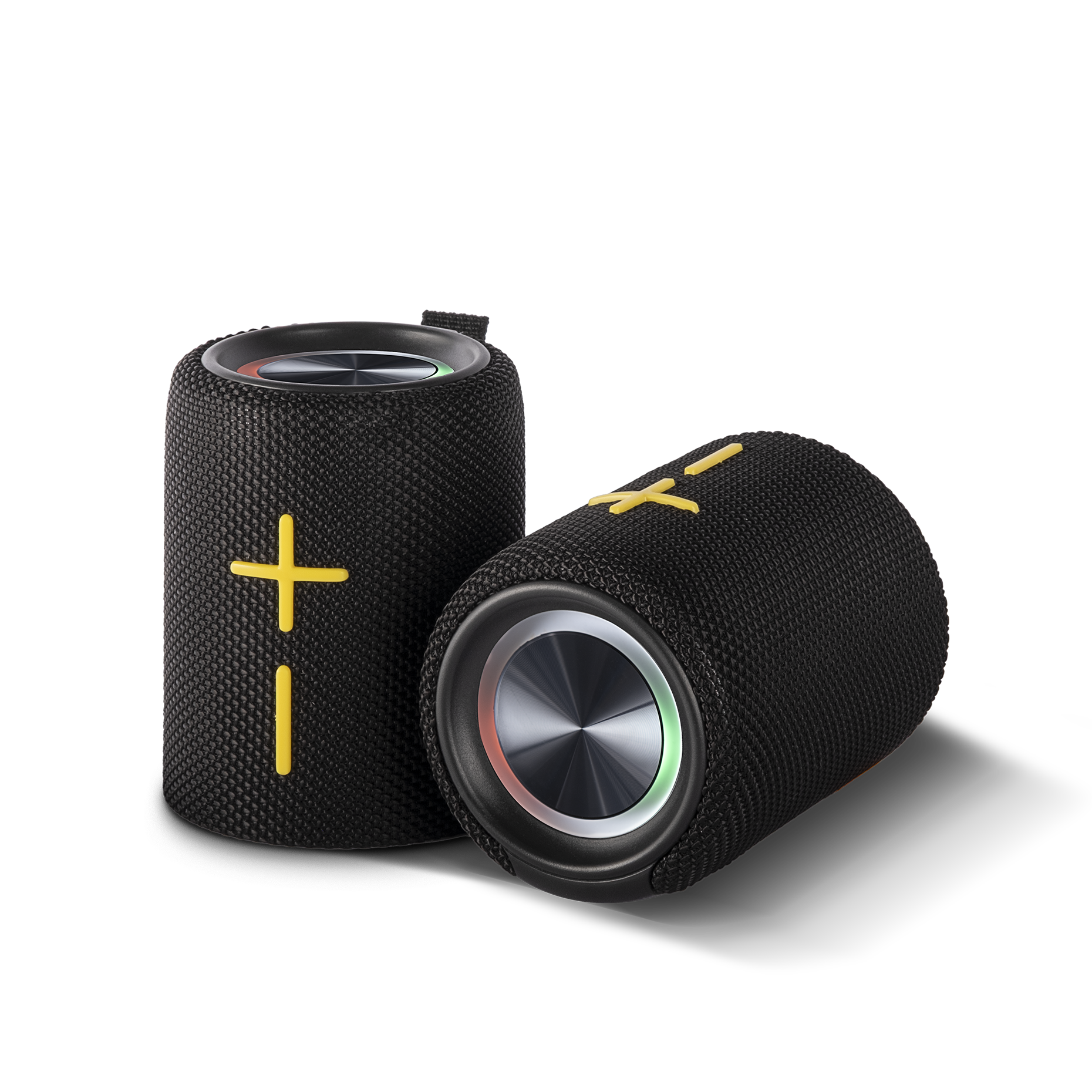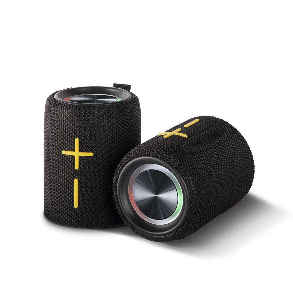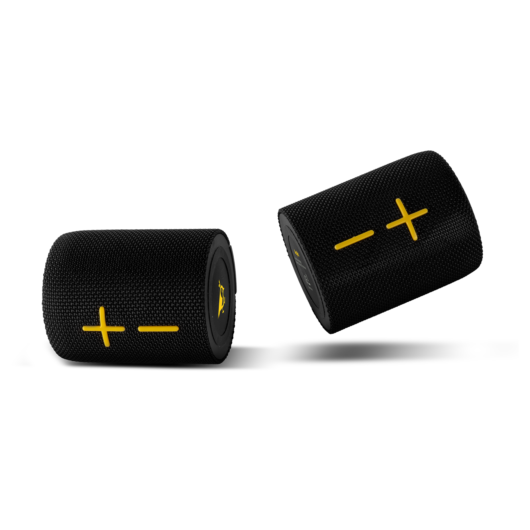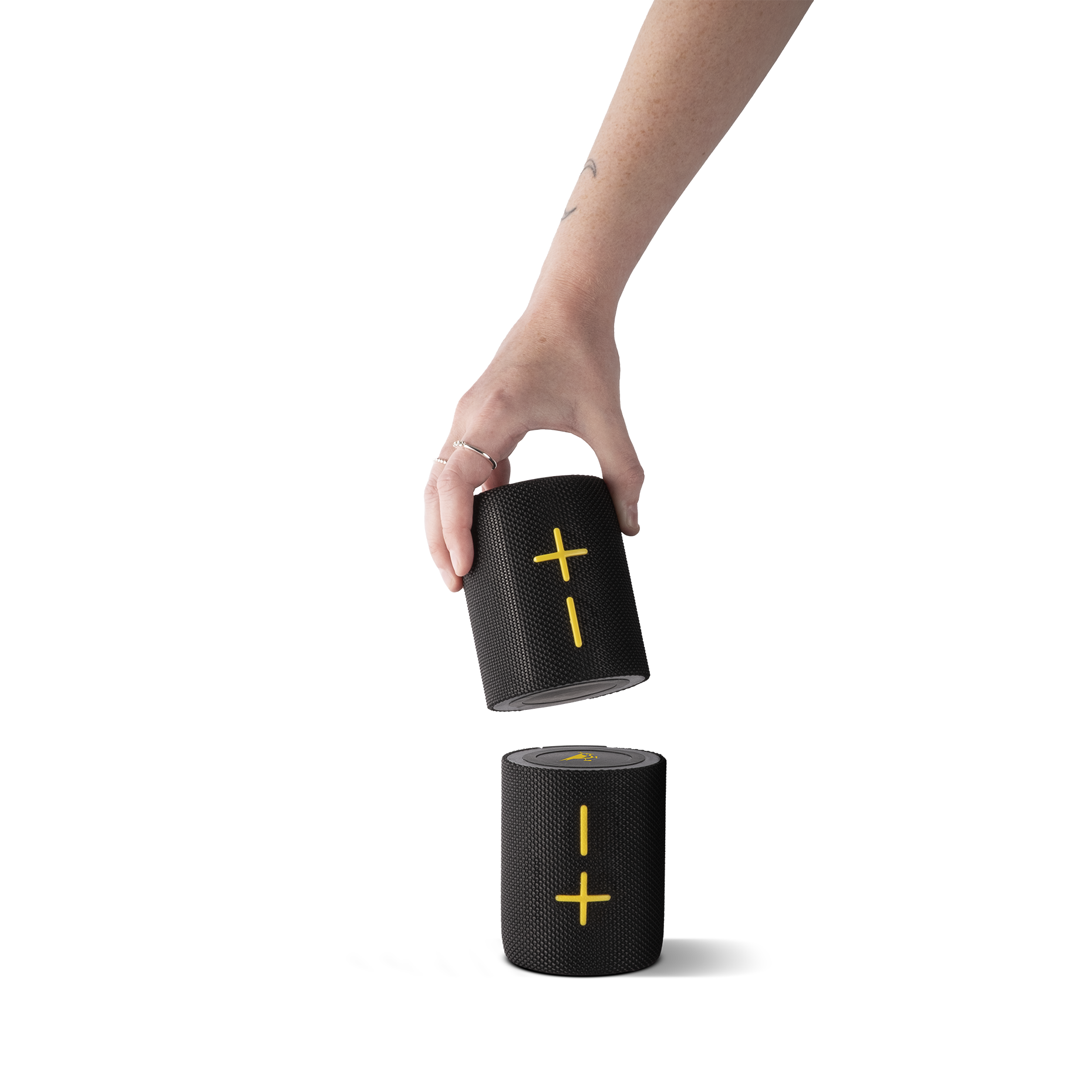 Portable 2-in-1 stereo speaker that twists apart into two wireless units. Waterproof, magnetic, and ready for immersive sound anywhere.